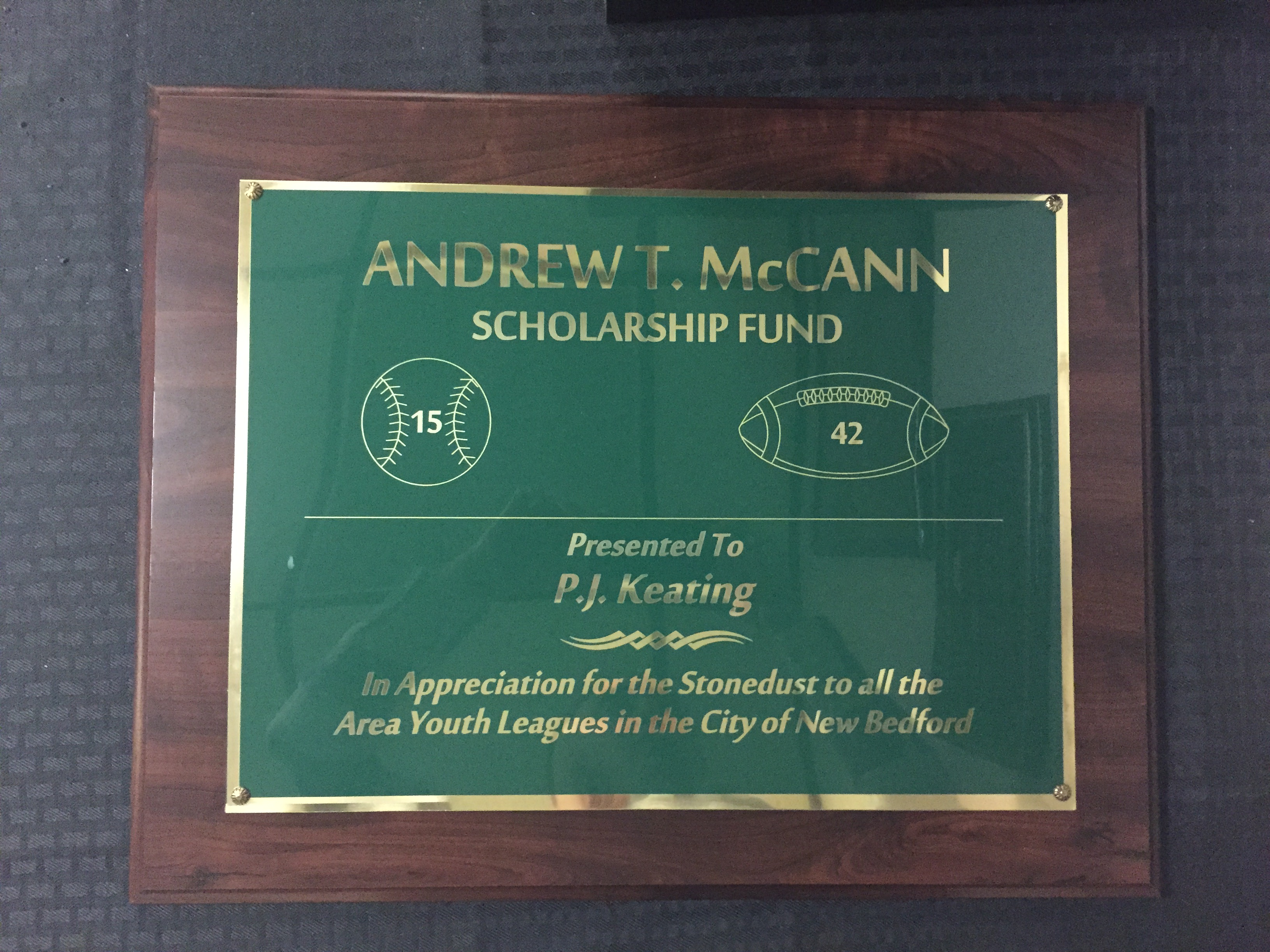 Today we were presented with this beautiful and much appreciated plaque for our donations of stone dust to the Andrew McCann Scholarship foundation. The Andrew McCann scholarship foundation has received over 80 loads of stone dust to replace and repair the ball fields in New Bedford. Andrew McCann Scholarship Foundation is committed to help the youths in the City of New Bedford have a fun, safe place to go to stay off the streets and provide financial assistance to those families with at risk youths who are in need.