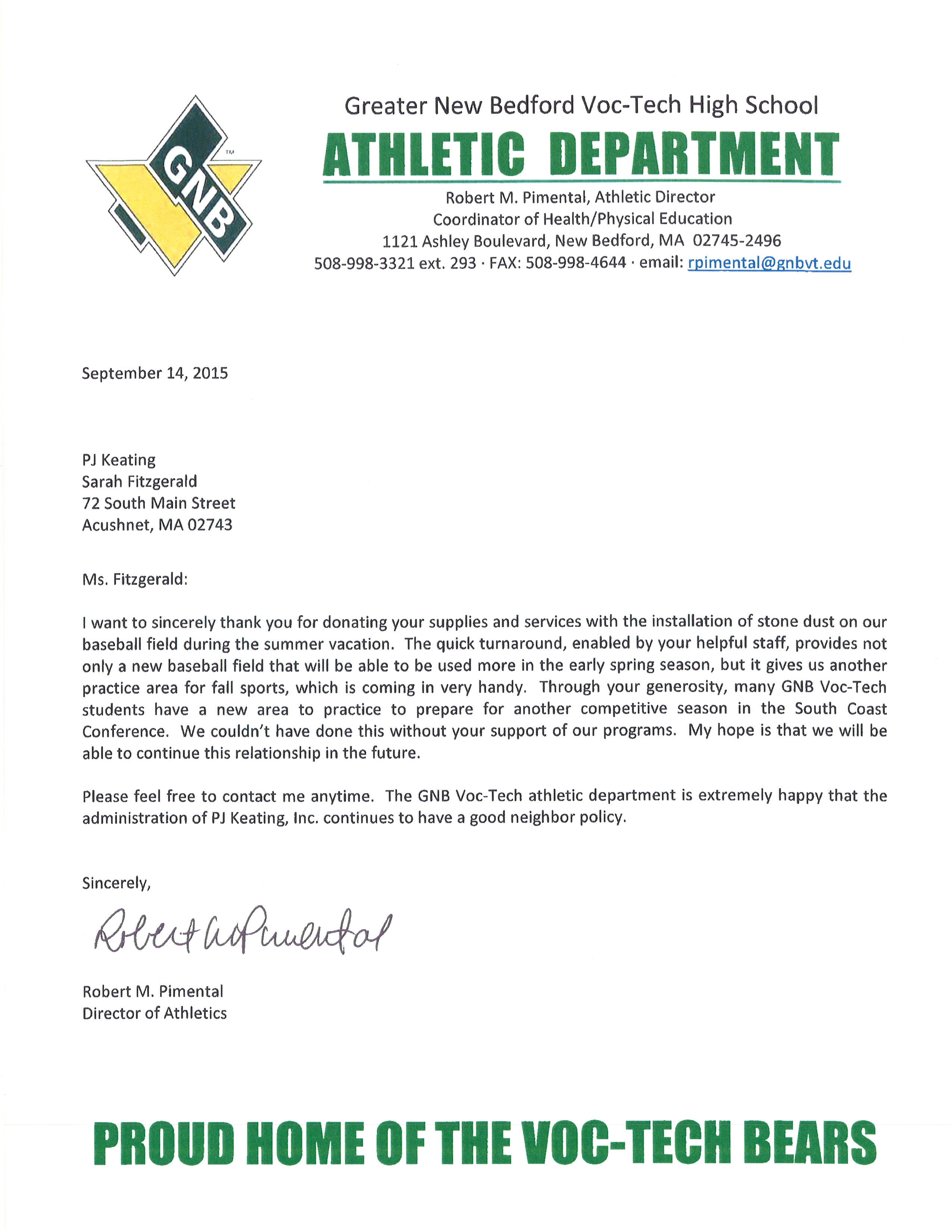 Greater New Bedford Voc-Tech Thank You Letter