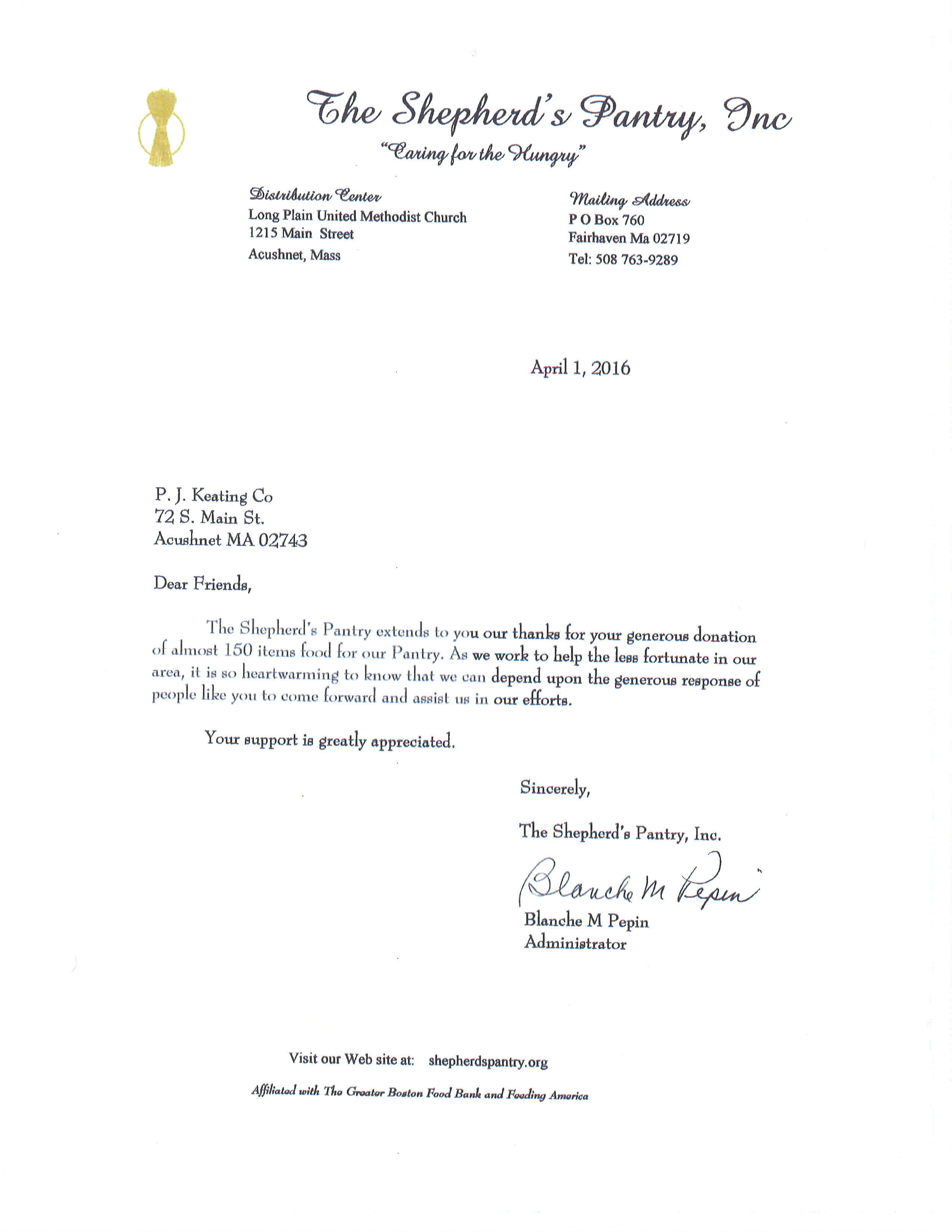 Thank You Letter - Shephard's Pantry